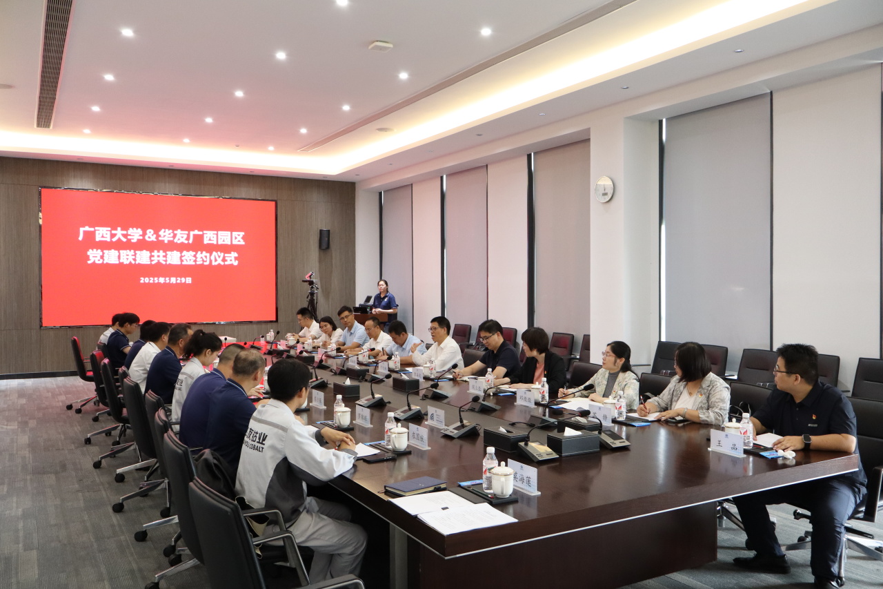 簽約儀式上,華友廣西園區(qū)黨委書記徐學良與廣西大學資源環(huán)境與材料學院黨委書記沈大強共同簽署黨委聯(lián)建協(xié)議,明確以黨建引領(lǐng)業(yè)務發(fā)展,推動產(chǎn)學研深度融合,實現(xiàn)資源共享、優(yōu)勢互補、協(xié)同共進。廣西大學黨委副書記寧旭初在座談會上講到,此次聯(lián)建共建是推動基層黨組織建設(shè)走深走實的重要舉措,也是實現(xiàn)“黨建+產(chǎn)業(yè)”“黨建+教育”深度融合的創(chuàng)新實踐。