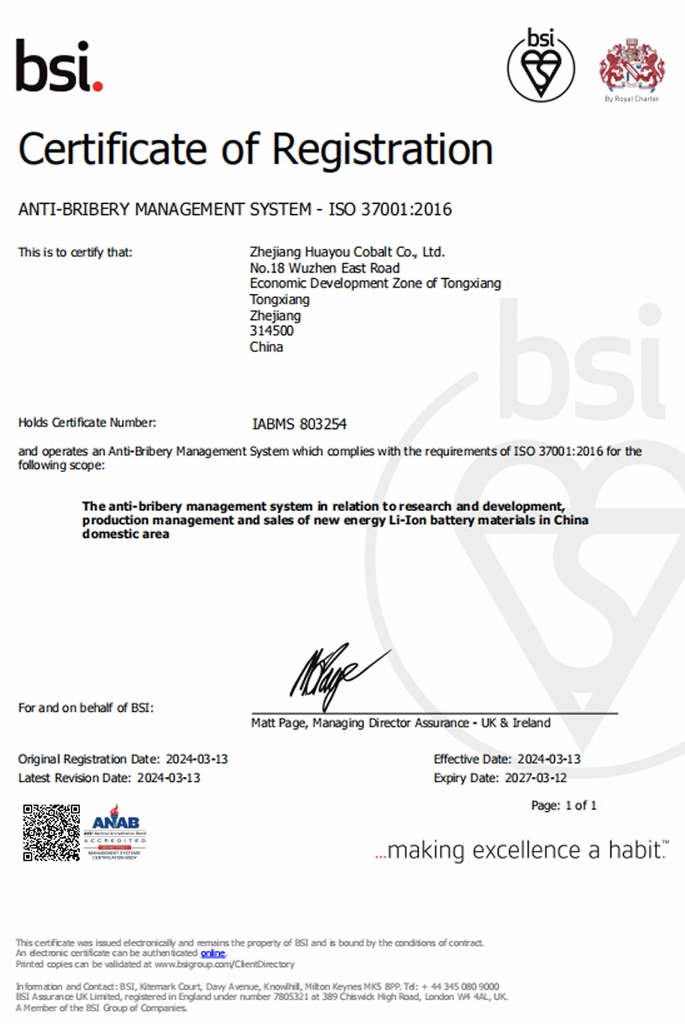 Under the audit of the British Standards Institution (BSI), Huayou Cobalt successfully obtained ISO 37001:2016 Anti-Bribery Management System Certification and related certificate, becoming the first company in its industry to achieve this accreditation. This milestone marks a significant advancement in Huayou's global compliance governance framework.
