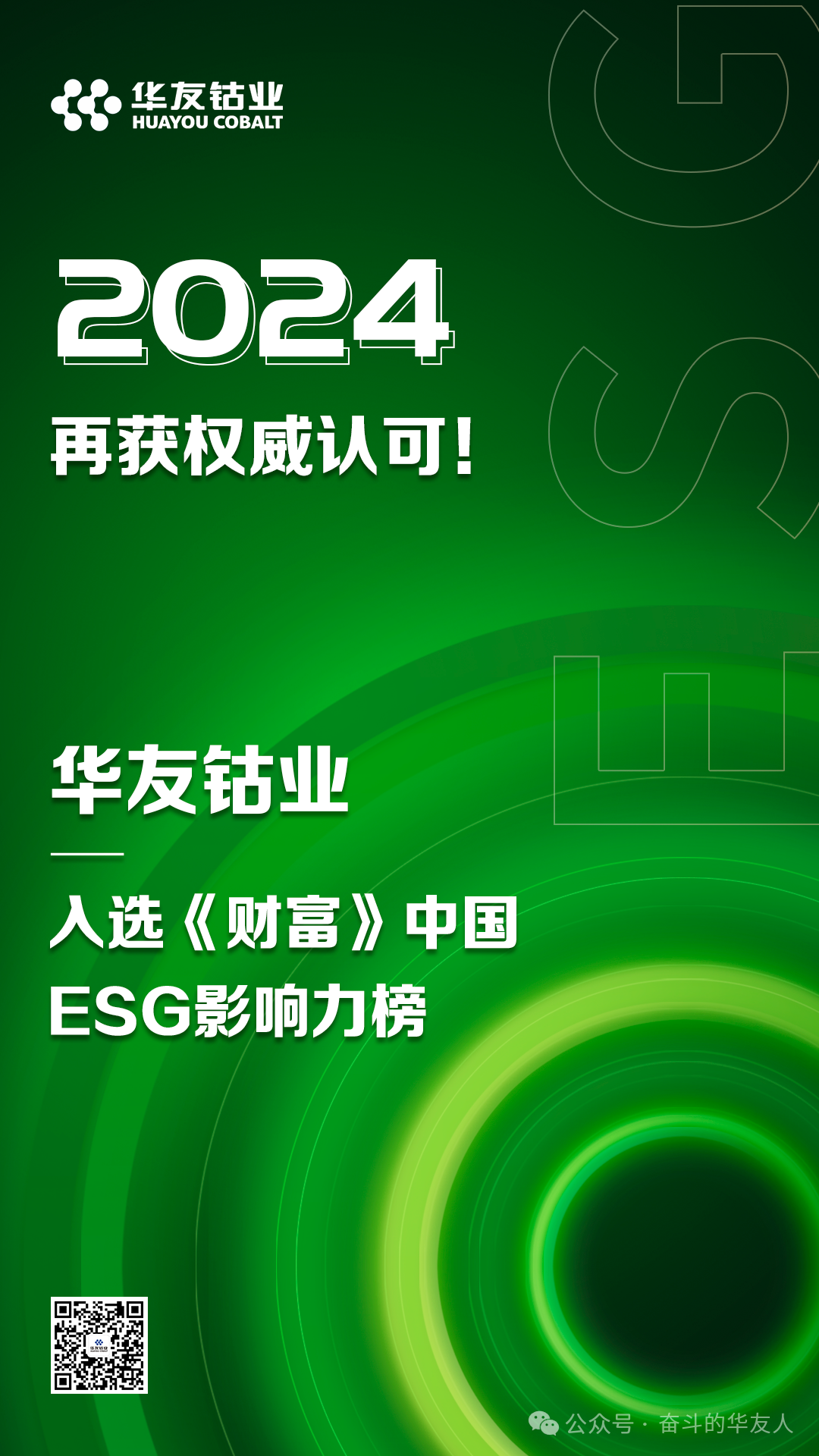 On 13th May, Fortune released the “2024 China ESG Impact List”, and Huayou Cobalt was successfully selected for its outstanding performance in environmental, social and governance (ESG) and positive influence in the field of industry sustainability. The list shows that in the battery and materials industry, there are only six companies on the list, and Huayou is one of them. This is not only a full affirmation of the company's long-term commitment to sustainable development, but also a high degree of recognition that it has always been active in fulfilling its social responsibilities in its business practices.