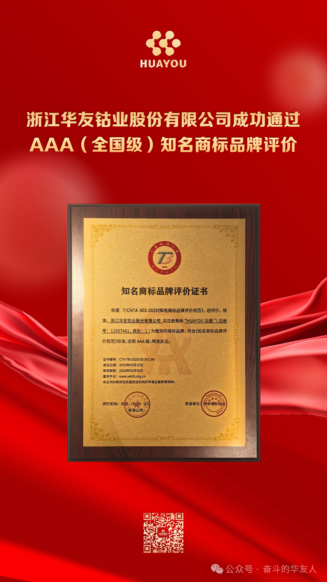 Recently, Huayou's registered trademark "HUAYOU and Graphic" was officially awarded the AAA (National-Level) Renowned Trademark Brand certification by the T/CNTA 002-2025 group standard (evaluated and certified by Brand Certification (Beijing) Co., Ltd. and reviewed by the Working Committee on Renowned Trademark Brands of the China Trademark Association). This marks the first time a company has achieved this distinction under the upgraded standard, and it also establishes Huayou as the first enterprise in the non-ferrous metals industry to pass the AAA (National-Level) Renowned Trademark Brand evaluation.