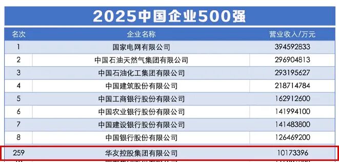Huayou Holding Group Ranks 259th Among China's Top 500 Enterprises in 2025!