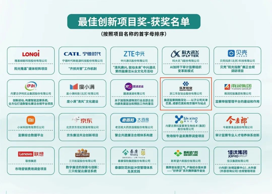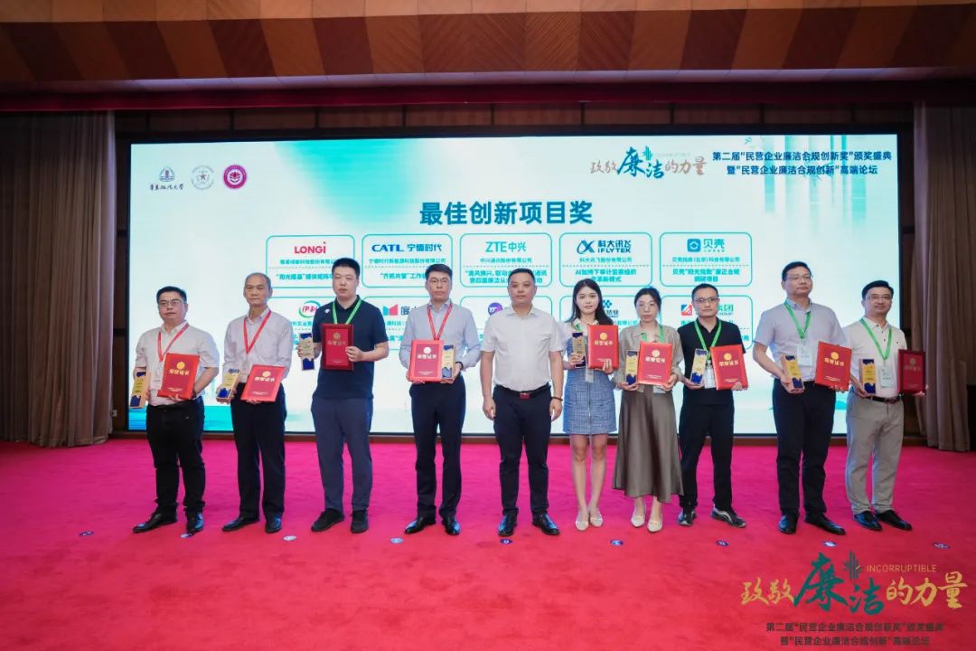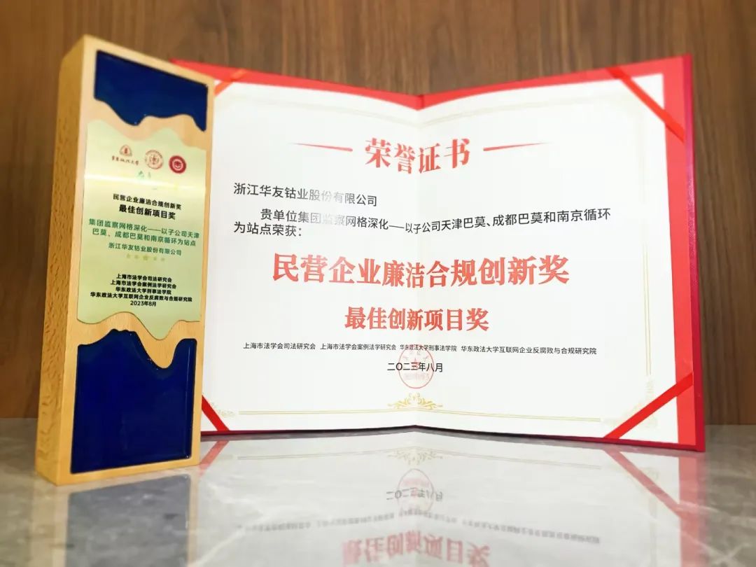 2023年8月3日,第二屆“民營企業(yè)廉潔合規(guī)創(chuàng)新獎”在華東政法大學長寧校區(qū)舉行頒獎盛典,華友鈷業(yè)監(jiān)察網格深化項目榮獲“最佳創(chuàng)新項目獎”獎項。