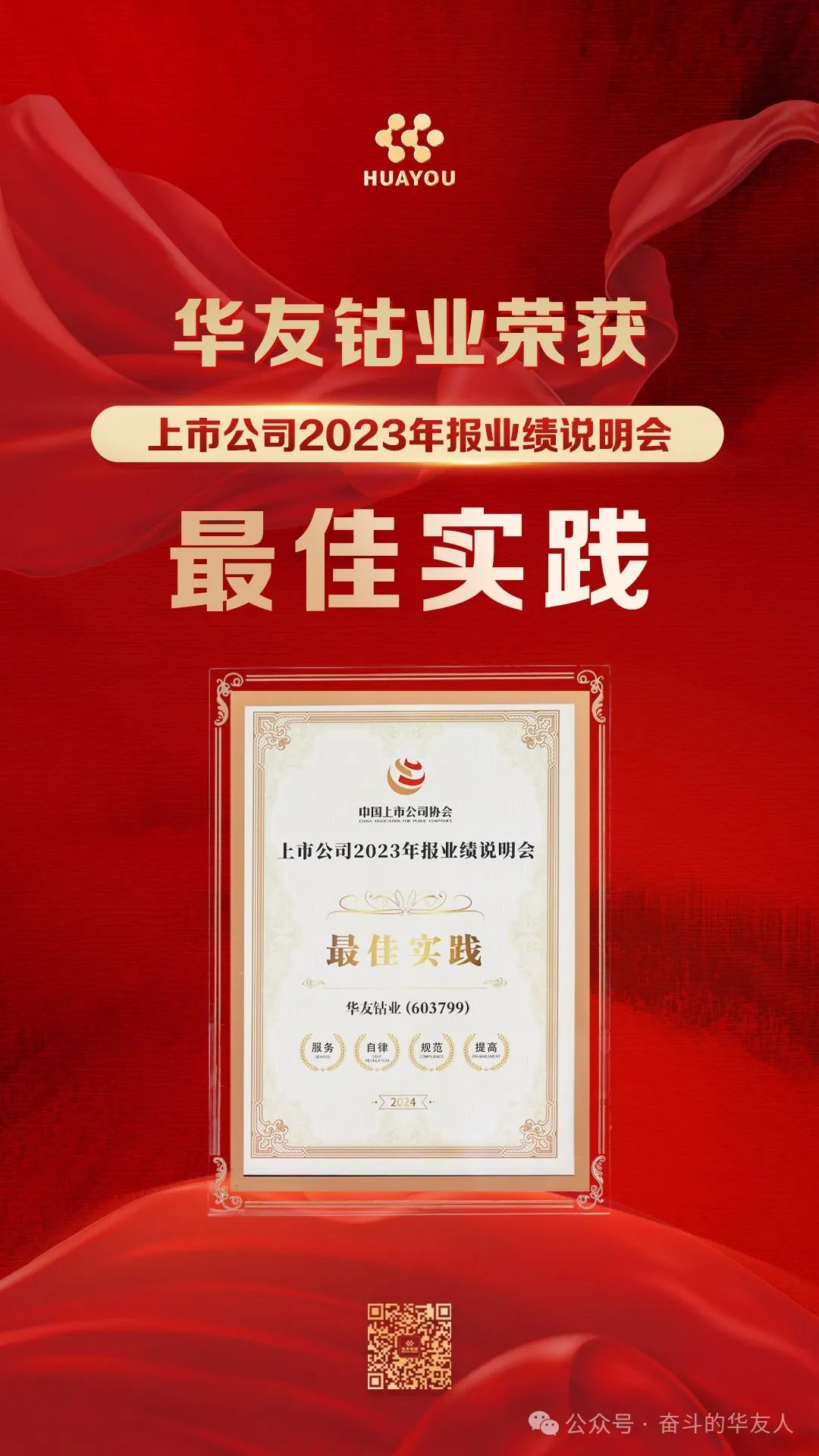 近日,由中國上市公司協會主辦的“并購重組政策宣導暨產融對接會”在重慶舉行,會上揭曉了上市公司年報業績說明會最佳及優秀實踐系列獎項評選結果。華友鈷業憑借2023年報業績說明會的精彩表現和與投資者的積極溝通,在滬深北交易所5130家上市公司中脫穎而出,獲評“2023年報業績說明會最佳實踐”。