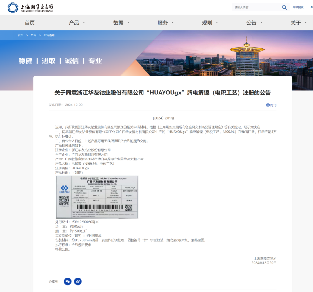 12月20日,華友鈷業子公司廣西華友新材料有限公司生產的“HUAYOUgx”牌電解鎳(電積工藝,Ni99.96)成功在上海期貨交易所(以下簡稱“上期所”)注冊,注冊產能為3萬噸。