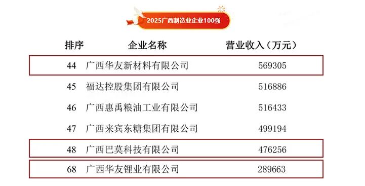而在更具針對性地反映產業硬實力的“廣西制造業企業100強”榜單中,華友廣西園區優勢更為凸顯,其中,廣西華友新材料有限公司位列第44名,廣西巴莫科技有限公司緊隨其后位列第48名,廣西華友鋰業有限公司排名第68位。